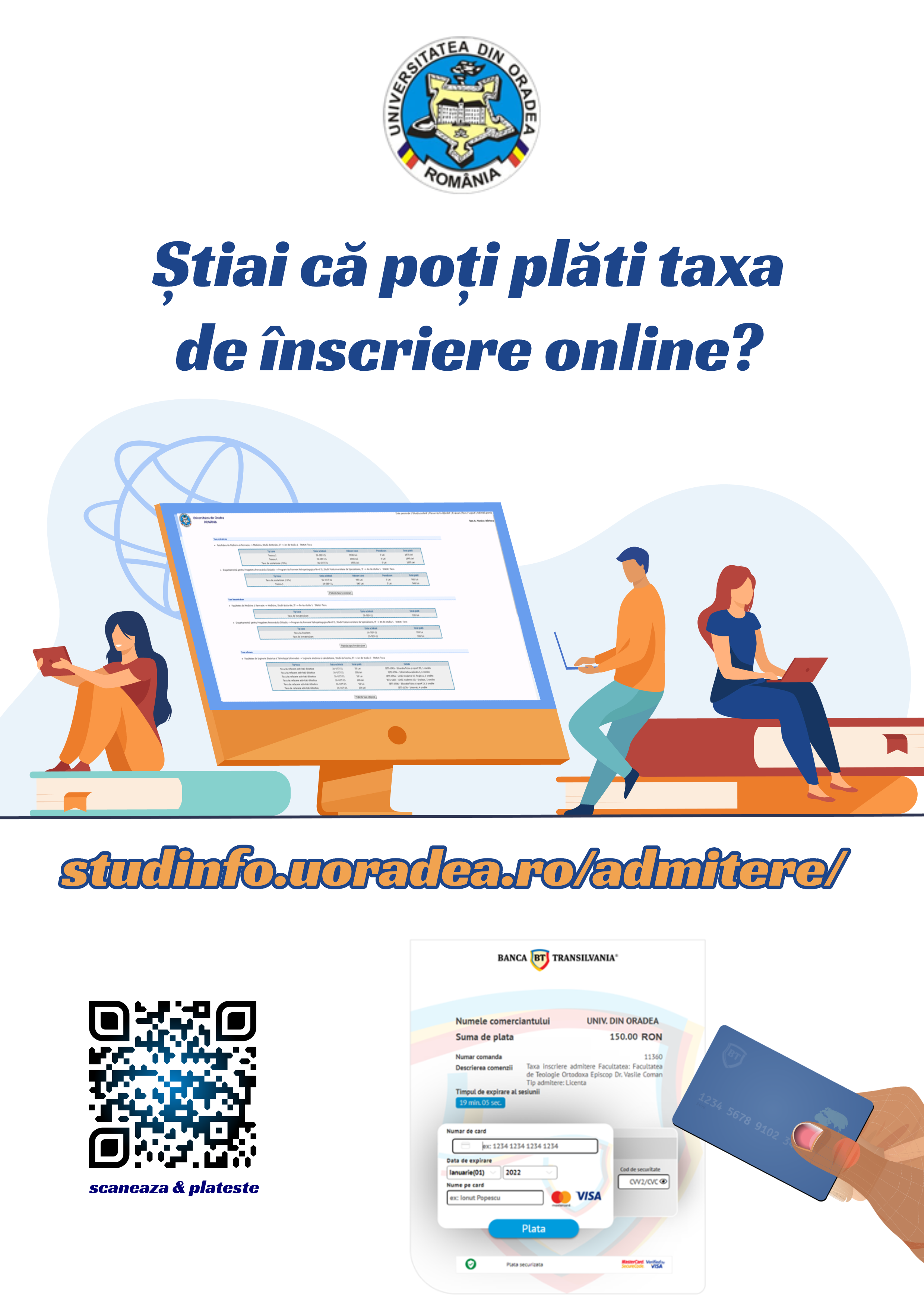 Înscrierile se fac la sediul facultăţii între orele 9-15 în zilele lucrătoare sau online prin încărcarea documentelor de către candidați cu asumarea responsabilității de către aceștia cu privire la autenticitatea și corespondența dintre documentele digitale/scanate și cele originale.
